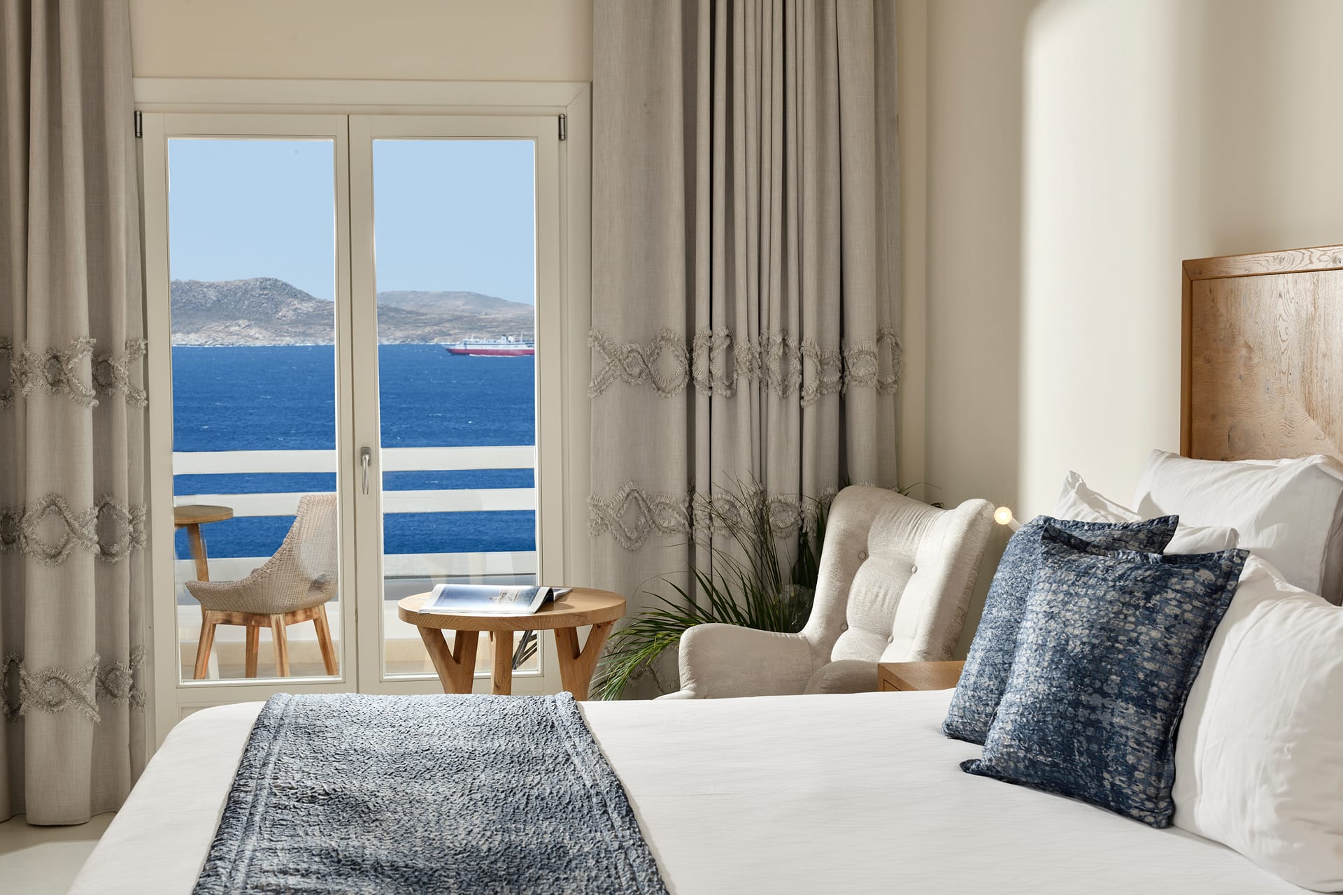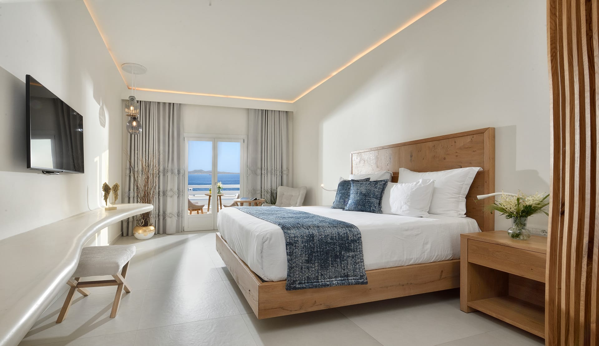Contemporary Mykonian style dominates the décor, but it is filtered by an abstract and airy look that relaxes you without depriving the opulent ambience. An organic palette and interiors injected with an underlying mood of simplicity and modernity, give the spaces a signature look. High quality beds range from king size to queen size will ensure your utmost sleeping comfort.