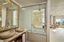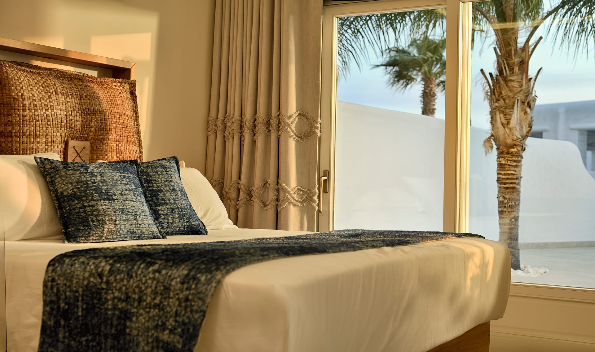Beamed ceilings, earth-toned textiles and wooden furniture introduce a healthy dose of laid-back Mykonian cool to the suite. World class amenities and delicate fabrics offer a cozy yet luxurious environment for guests who want well appointed spaces to indulge to themselves.