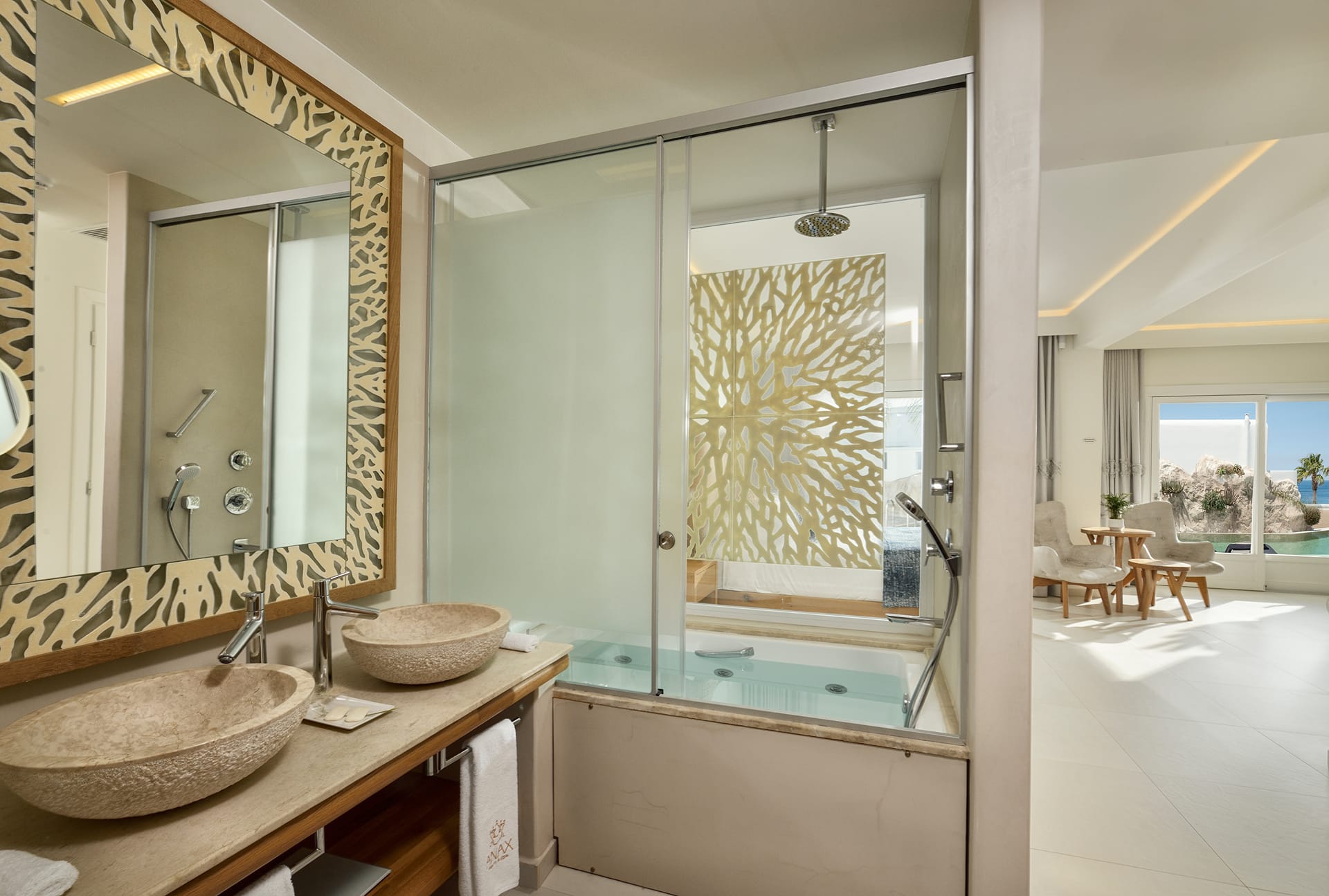 Delicate lines of Cycladic architecture, luxurious simplicity and high aesthetics are the main characteristics of the white serenity of the Exclusive Suite Side Sea View, featuring their very own private swimming pool.