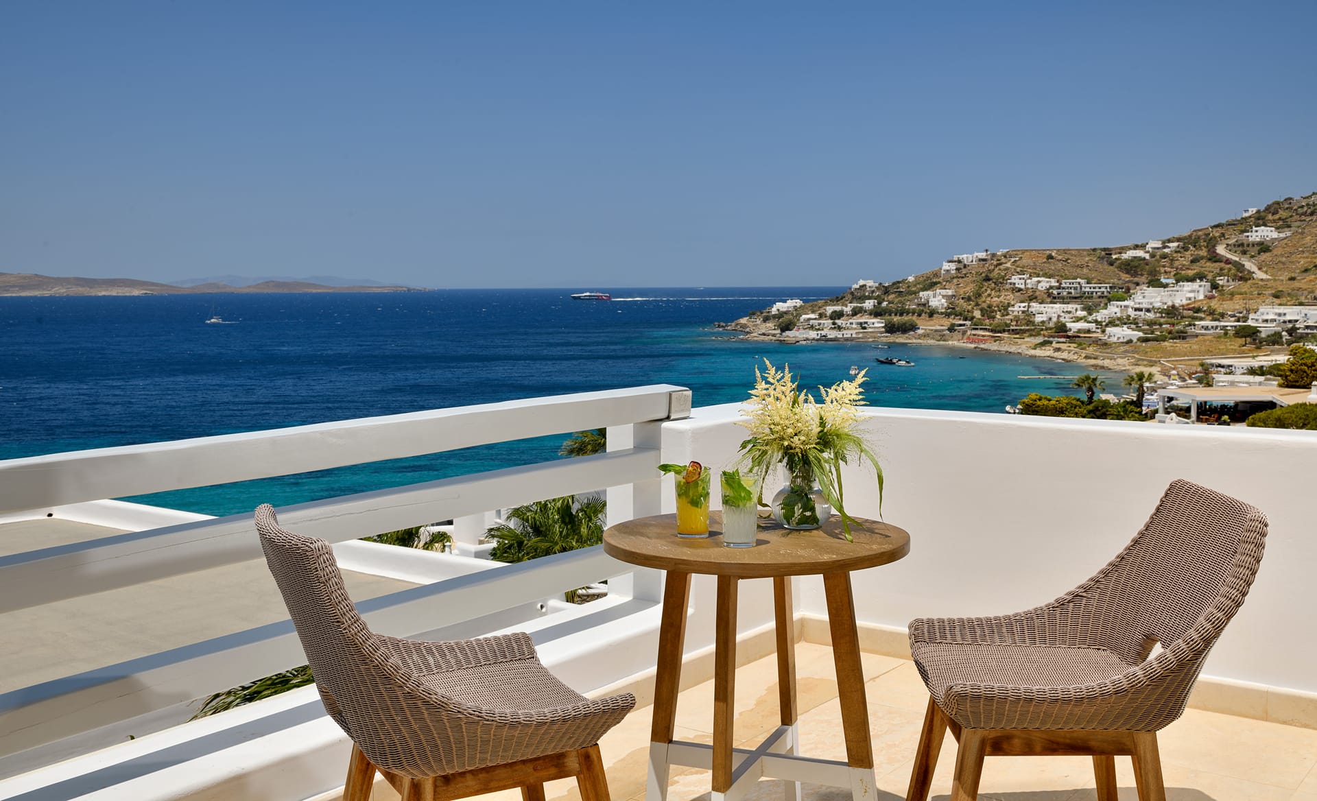 Take in the magnificent view of The Aegean blue through the glass window of the stylish and opulent Executive Suite. World class amenities and delicate fabrics offer a cozy yet luxurious environment for guests who want well appointed spaces to indulge to themselves.